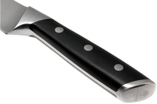 The Böker Forge carving knife 11 cm BO03BO506 combines an innovative design with premium materials. It is perfectly balanced thanks to the full-tang handle. Especially considering the long blade. As such the knife feels great in hand. Effortlessly cut the most beautiful slices of chicken, rolled meat or other prepared meat. The blade is made from razor-sharp German stainless X50CrMoV15 steel. The blade does not contain a crop: this means that you have more blade you can use and it is also easier to sharpen. The great ABS handle seamlessly merges with the blade steel. As such dirt won’t be able to accumulate. You introduce your home to German decency with this Böker Forge carving knife.