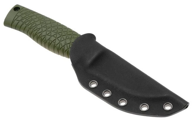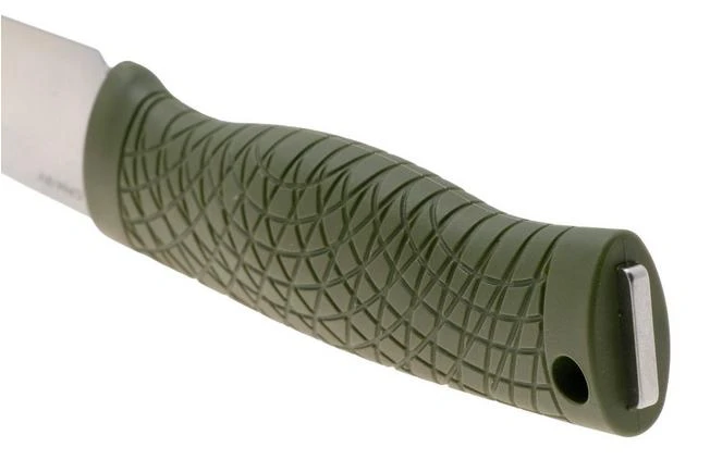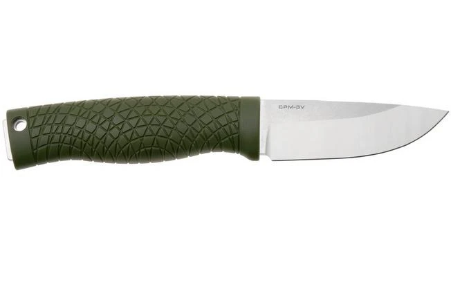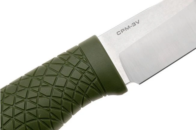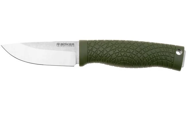 The blade of the Böker Manufaktur Bronco Mini Saber 121501 Stonewashed 3V, Green TPE, bushcraft knife measures 8.8 cm in length and 3.5 mm in thickness. The total length is 20.8 cm.