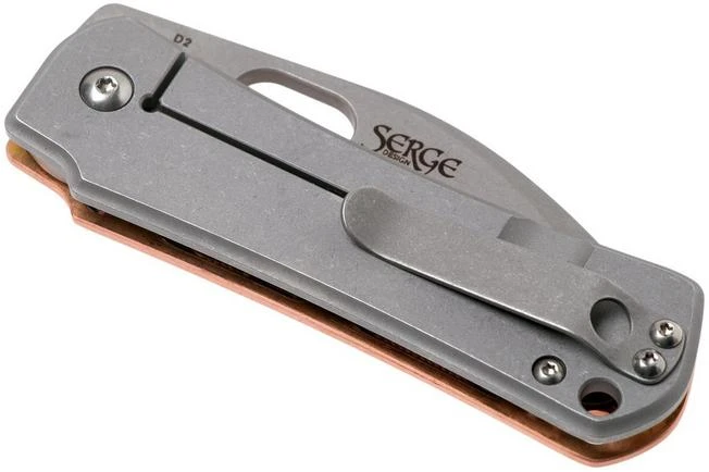 The Böker Plus Gust Copper 01BO146 is an artistic pocket knife, designed by Serge Panchenko. Anyone who knows the work of this designer will recognize Serge’s hand. His knives often have a ‘vintage’ look and feel. Böker reproduced this with a rough stonewashed-finish on the handle and the D2-steel blade. You open the Böker Plus Gust with the finger hole after which the blade is locked by a solid framelock. With the pocket clip you can easily and discretely carry the knife in your pocket.