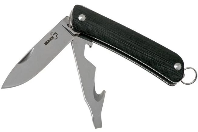 The pocket knives from the Böker Plus Mini Tech-Tool collection might all remind you of the famous Swiss pocket knives. Instead of a traditional red plastic scale these new knives are enhanced with G10 scales. The blade is made from Sandvik 12c27-steel, a stainless type of steel that was specifically developed as a knife steel. The blade is enhanced with a remarkable hollow grind. As such it is thin above the edge, which improves the cutting properties. It doesn’t contain a real lock, but a slipjoint firmly keeps the blade in place when opened. The back of the handle is enhanced with a keyring.